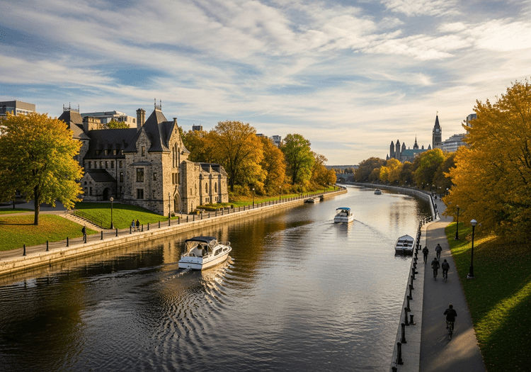 A capital federal combina segurança urbana, mercado de trabalho estável (baseado no governo federal e parque tecnológico Kanata North) e custo intermediário. Aluguel médio de CA$ 2.490 para dois quartos.